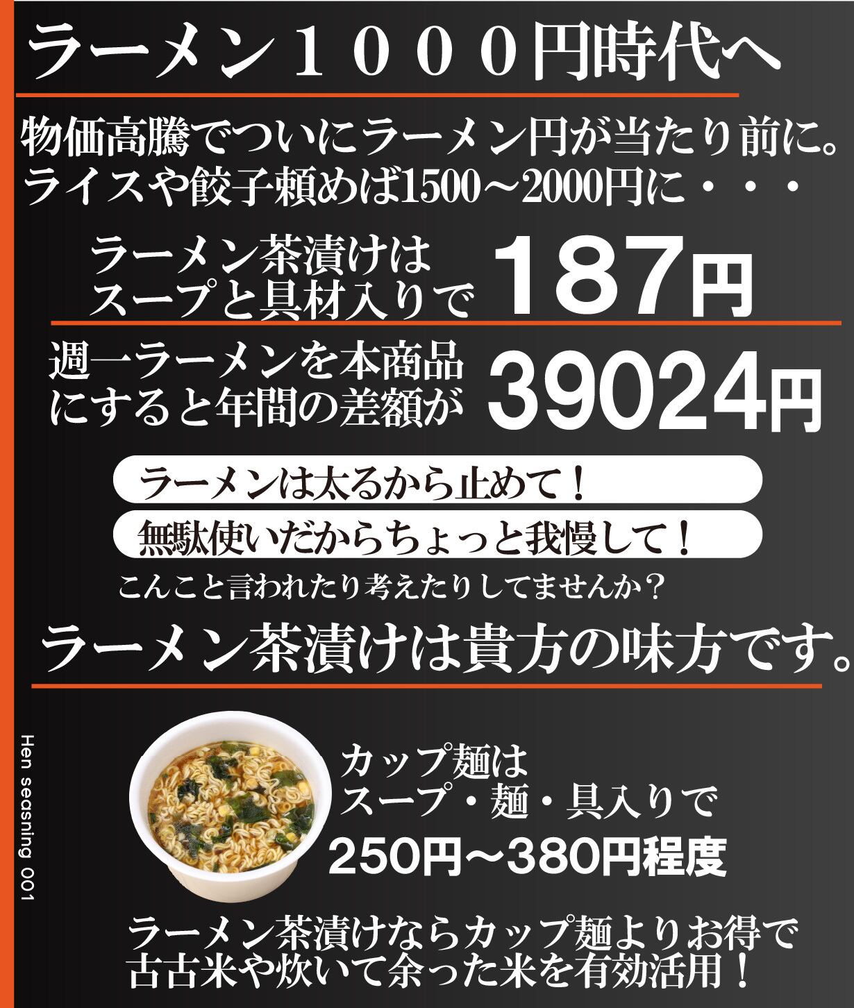 横浜家系豚骨醤油らーめん風茶漬け! 濃厚な味わいの豚骨スープと香ばしい醤油のコクが感じられる、まるでラーメンを楽しんでいるかのような新感覚の茶漬けです。ご飯にかけるだけで手軽に楽しめるので、忙しい日常でも本格的な味わいを味わえます!